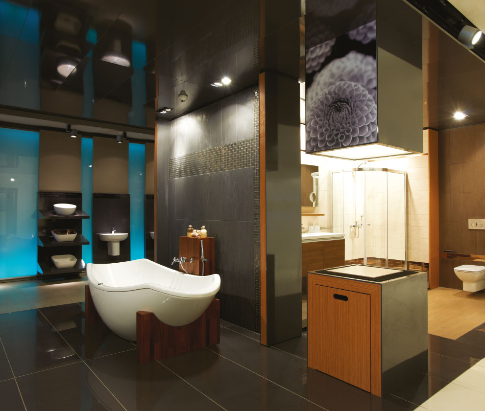 One of the main problems of bathroom products stores is the difficulty to change in time. Usually stores need to go under long term constructions. The system solves the problem with modular exhibition elements that are modified and easily changed as the store and the products inside change in time. The sanitary displays hung on the glass wall can easily be moved, replaced, added. Likely, the new product displays located at the entrance are a solution to easy, fast distribution and assembly of the new products to hundreds of stores at the same time.