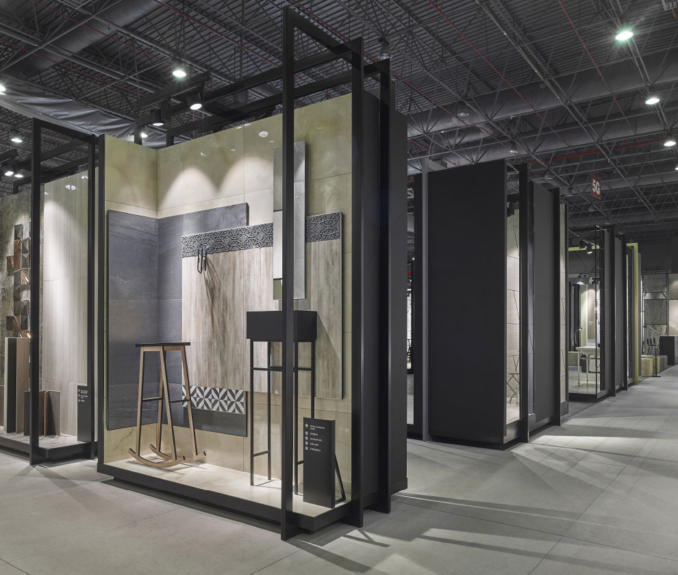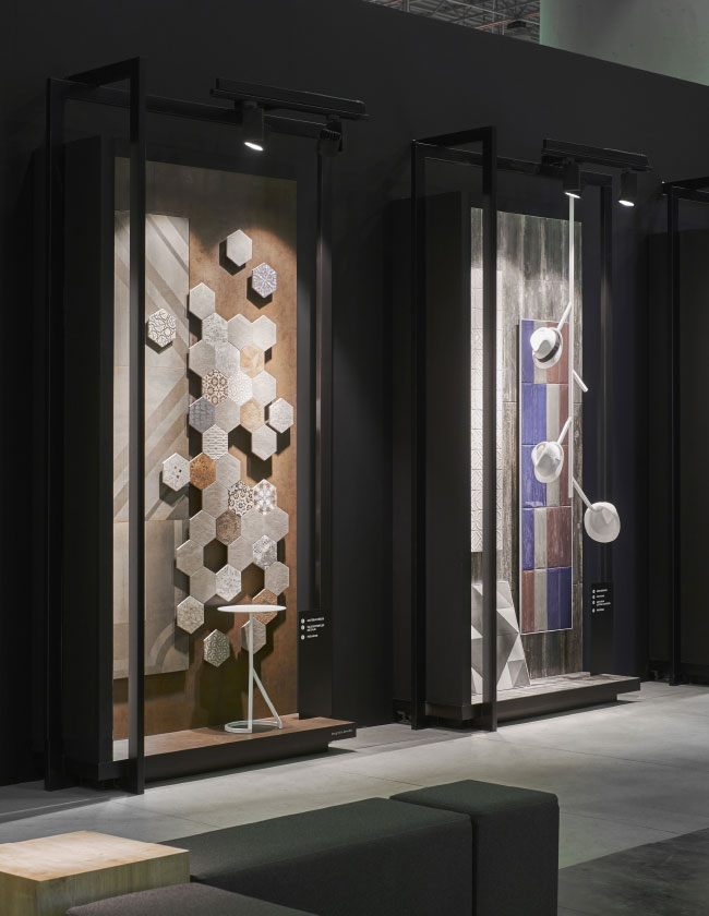 the alternatives of using different products with semi-abstract space suggestions. The five bathroom proposals located around the experience area stand out as inviting spaces with