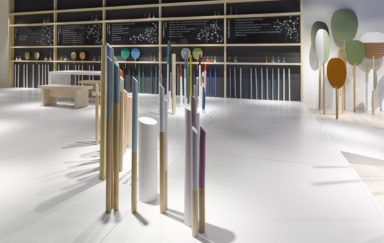 At the points where the viewer encounters with colors, Uchiwa-type fans which have a deep-rooted background in Japanese culture, on which painters applied various designs and textures throughout history, and bamboo abstractions that are used in the production show themselves. While these design elements create a magical atmosphere with the patterns and colors applied to them, the interactive environment is provided with a mini-fan that the visitor can work on his / her imagination.