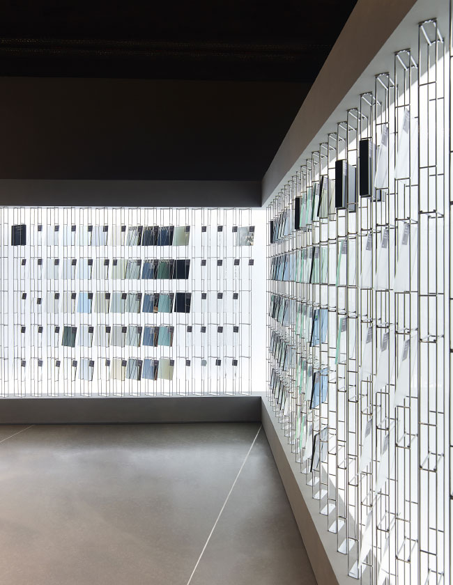 The unit that exhibits 130 different glass types of various characteristics and compositions lets the brand present its wide product range all together. The functional design with the sliding system makes it easy to examine each product separately.