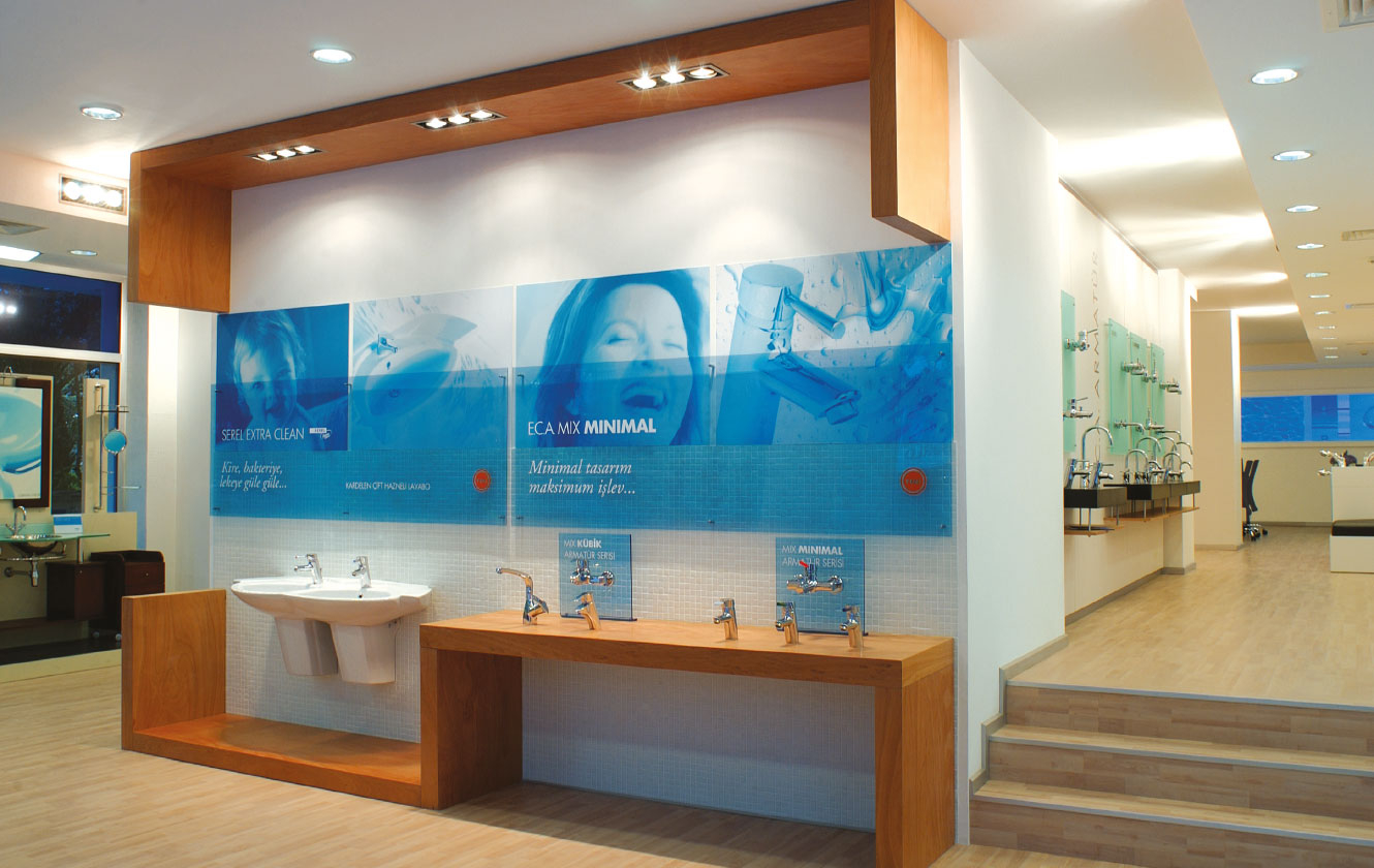 Mağazaların tasarım çizgisini, üstün teknoloji temsilcisi, güçlü bir marka olgusunun; tasarlanmış, hijenik ürünler ve su teması üzerine geliştirdik. Minimalist ve prestijli...