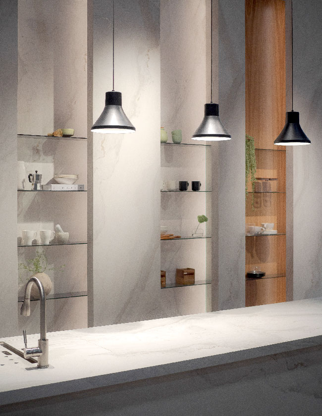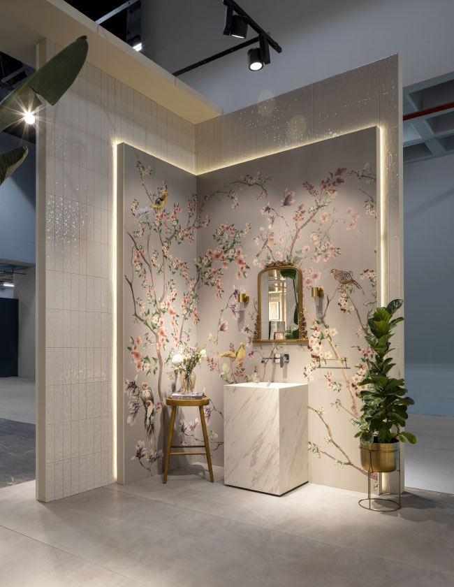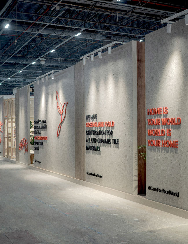 Sergileme alanını baştan sona kavrayan ve “İyi Bak Dünyana” adı verilen uzun duvar boyunca Kale’nin çevreci ürünleri, sanat ve tasarım ile ilişkisi ve sosyal fayda projeleri sergileniyor. Sergileme alanının merkezinde ise yeni ürünlerin bir doğa stilizasyonuyla soyut sergilendiği alanlar yer alıyor. Yeniden kullanım amacıyla tasarlanan “İyi Bak Dünyana” duvar konstrüksiyonu esnek ve modüler bir yapı imkanı sunarak sürdürülebilir mekan tasarım stratejisine katkı sağlıyor.
