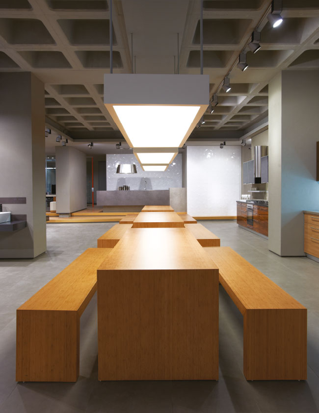 Mağaza görsel stratejisinin temel unsurlarından olan BetonArt sıva yüzeyli duvarlar, hem çağdaş mimari vurgusu yapmakta hem de mutfak bölümün yapısal temelini oluşturmaktadır.