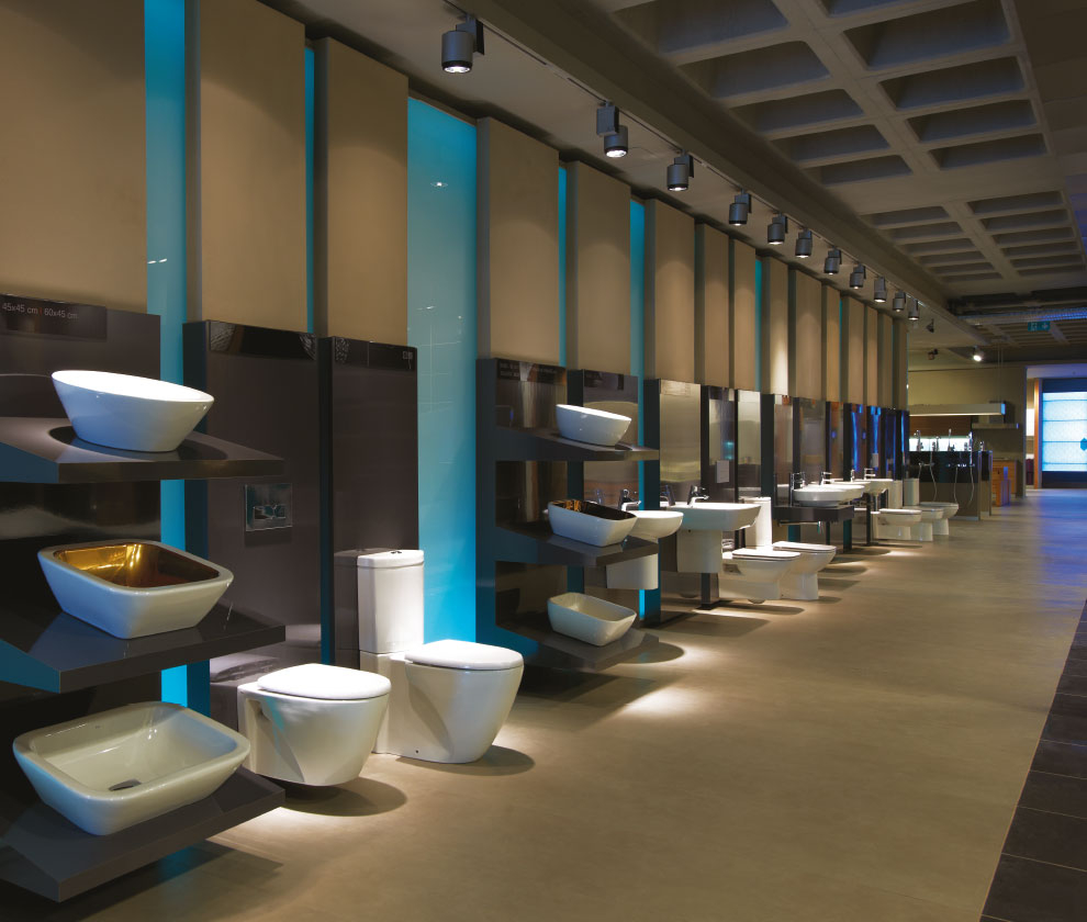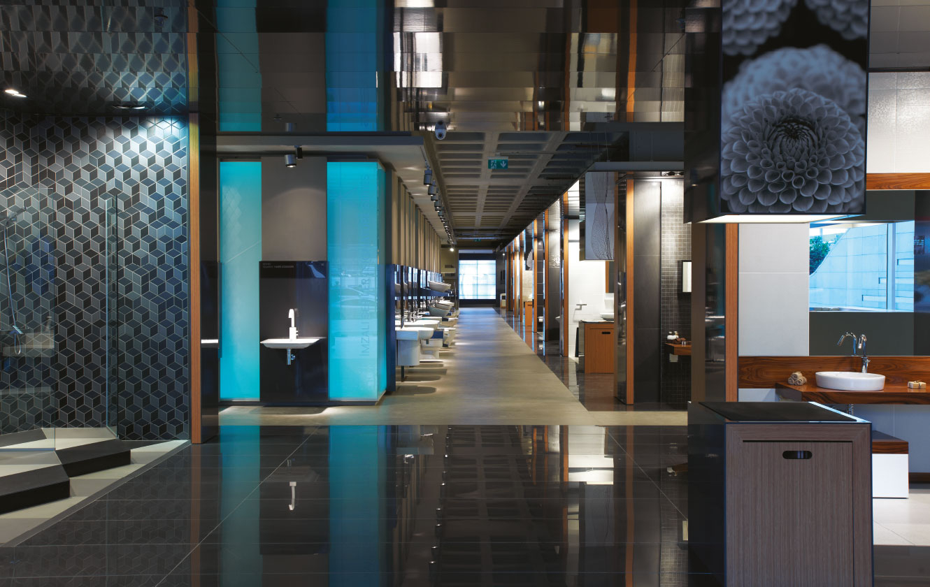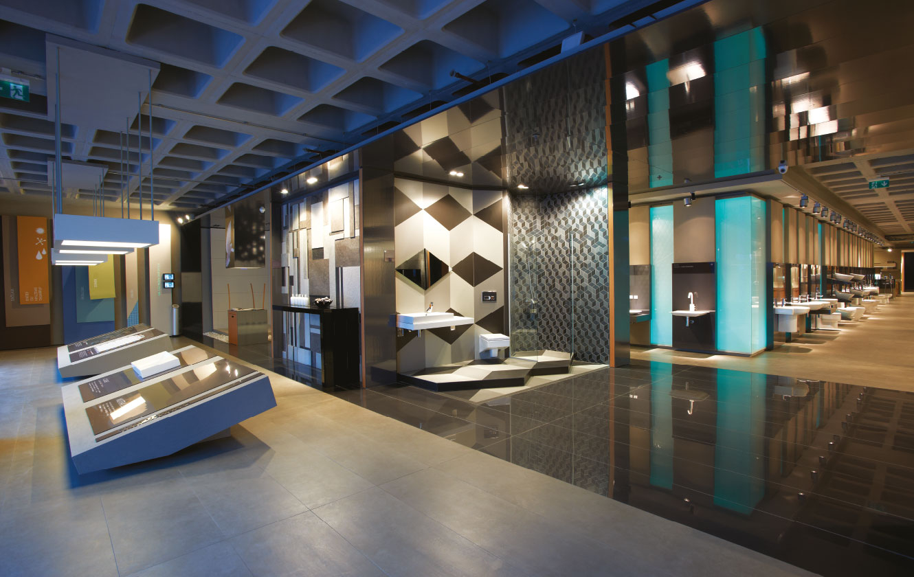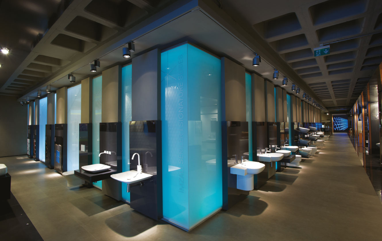 Diğer ana sirkülasyon aksı ise teknik koridora paralel bir şekilde ilerler... Ziyaretçiler bu iki aks arasında geçiş yapabilmekte ve ortalarında yer alan ürün sergileme birimlerini rahatlıkla gezebilmektedir. Binanın çekirdeğini saran, mavi renk ile aydınlatılan cam duvar, mağaza içerisinde su soyutlaması için kullanılır. Bu bölümde vitrifiye ve hemen yakınında armatür ürünleri sergilenir. Bu ürünlerin sergilemesi hem ürün gruplamaları yapmaya uygun, hem de ürün değişimlerinin kolayca yapılabilmesi mantığı üzerine kurgulanmıştır.