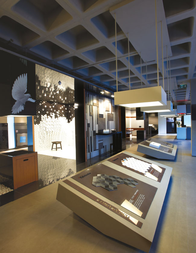 Mekanda yer alan ürün grup sergileme alanları; yaratılan gri, nötr bir fon içine yerleştirilmiş dikdörtgen prizmalar ile oluşturuldu. Bu prizmalarla birlikte, ürün grup ve fonksiyon bölümlerine rahat ulaşımı sağlayan iki ana sirkülasyon