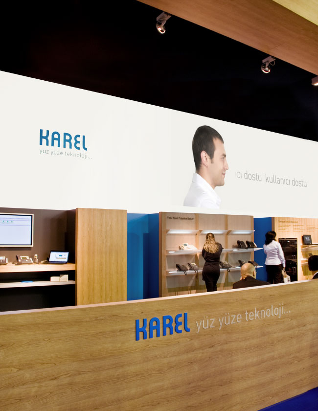 Ekranın altındaki raflar boyunca Karel operatörleri ve telefonları sergilendi. Materyaller ve renkler açık, teknik ama yine de sıcak bir his vermek için seçildi.