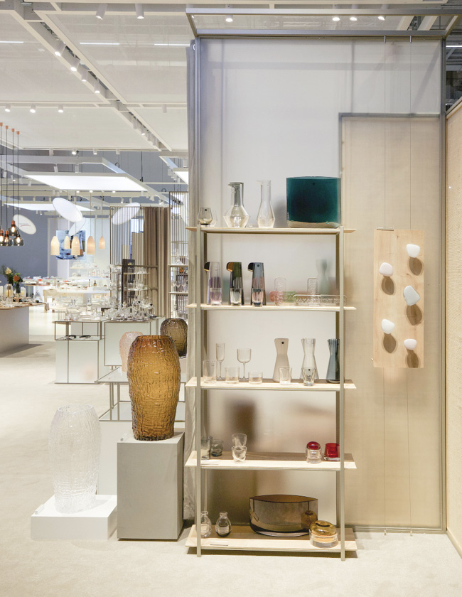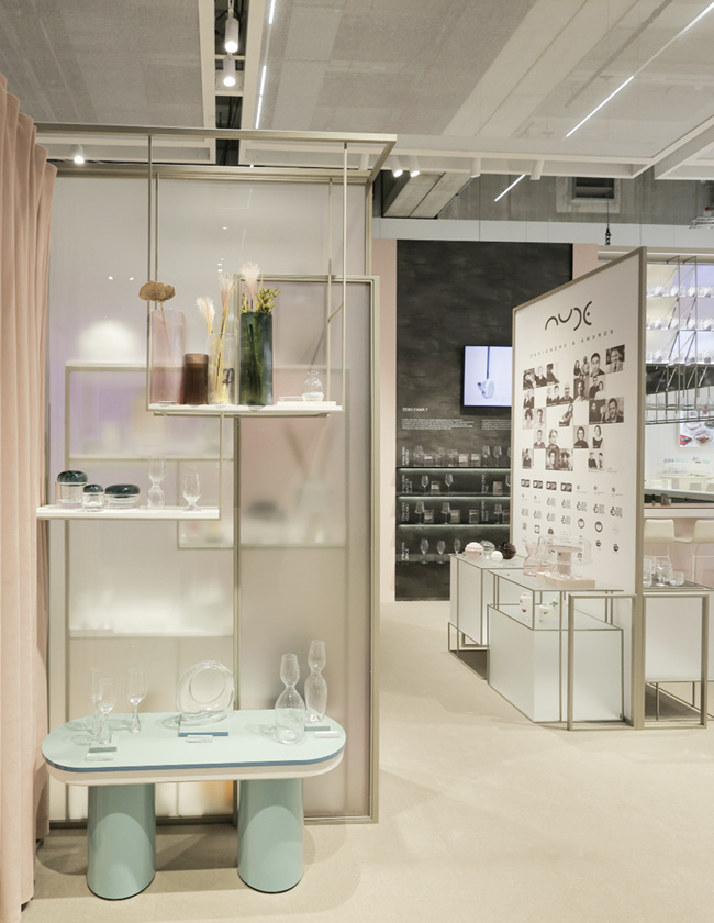 Sergi atmosferini modern sadeliğin estetiğiyle yansıtan çağdaş yaşam alanları, duru tasarım detaylarıyla zenginleştirildi. Cam objelerin şeffaflığını ve inceliğini yansıtan sergileme birimlerinde; metalin zarif mimarisi, sisli cam küplerle ve kadifenin şık dokusuyla bir araya getirildi.
