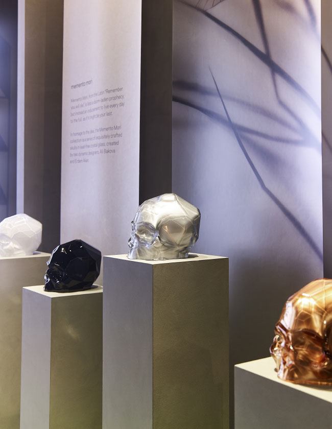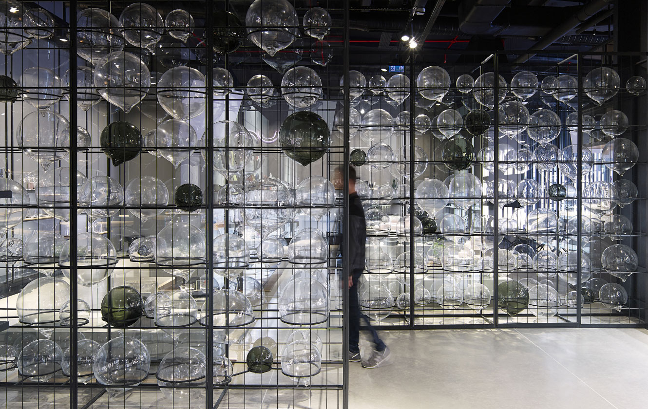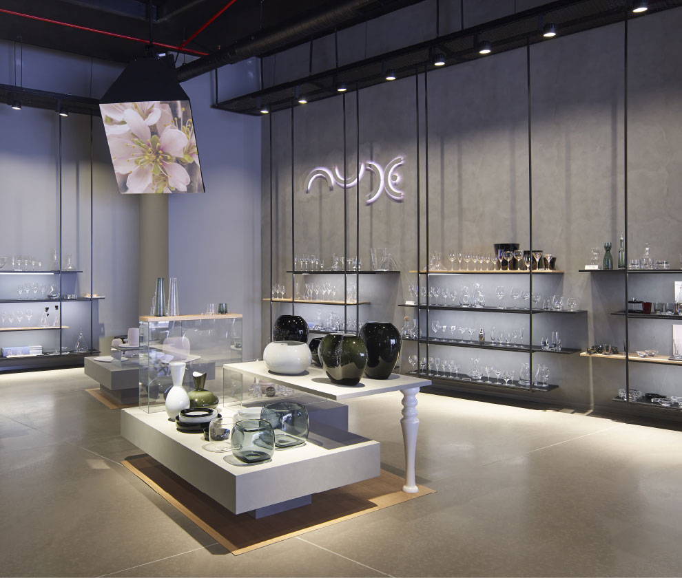 Nude showroom, yalın ve şık tasarımı ile ziyaretçileri sofistike dünyasına çağırıyor. Paravan fonksiyonu üstlenen, farklı ebatlardaki el yapımı cam kürelerden oluşan etkileyici enstalasyon Nude’un yalın dünyasına açılan ilham veren