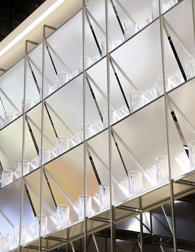 Barın kesişen açılarla bir araya gelen parlak metal yüzeyleri, ışık ve renk kırılımlarıyla mekana dinamizm ve zenginlik katarken, camın şıklığını yansıtan bir buluşma noktası oluşturdu.