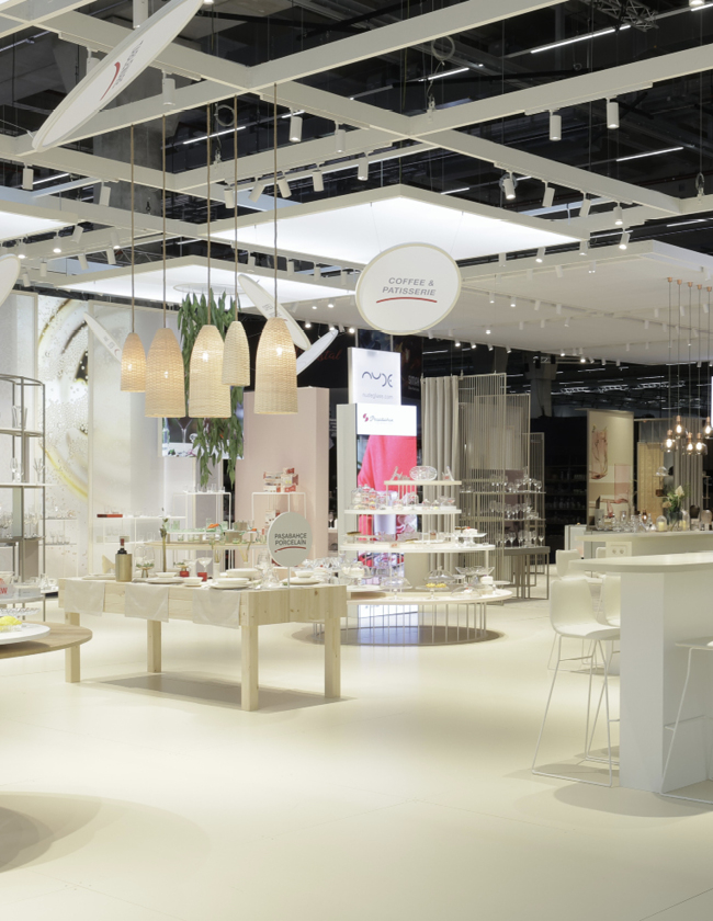 HoReCa dünyasının gereksinimi olan sıcak ve samimi iletişim dilini teknolojiyle buluşturan, mekan derinliğini öne çıkartan cephe sisteminin yarı transparan malzemesi; davetkar bir karşılama sunarken, sergileme birimlerinde tercih edilen; ahşap, mermer, hasır, çelik ve cam gibi çevreye duyarlı malzemeler, koleksiyonları farklılaştırarak öne çıkaran sahneler yarattı.