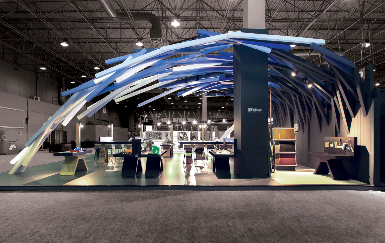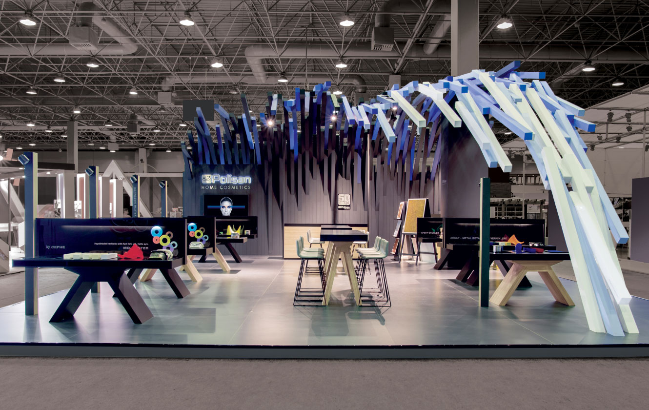 Bir çok prizmanın bir araya gelmesi ile oluşan örtü, markanın ilham veren değerinin yanı sıra zorlu ve yoğun işçiliği ile titiz, profesyonel ve uzman bir marka oluşuna vurgu yapmaktadır… Ziyaretçilere farklı bir deneyim yaşatan Polisan standı üç ana koldan sınırları kaldırılmış davetkar yapısıyla samimi bir iletişim yolunu önermekte.