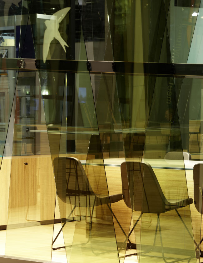Şişecam Trakya Cam standı, cam sanayisi ve tedarikçileri için Dünya’nın en büyük uluslararası ticaret fuarı olarak kabul edilen Glasstec fuarında 275 m2 alan içerisinde ve 5 m. yüksekliğe uzanan 346 adet cam panelin bir araya gelmesiyle oluşturuldu.