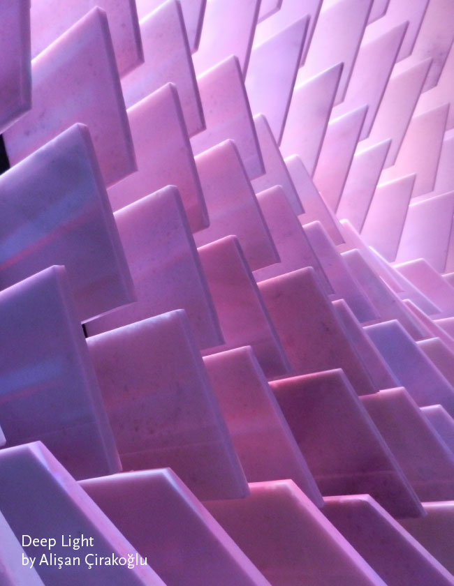 “Işıkla Yıkanmak” sergisinde, mermer, su ve ışığa odaklanarak, temizlik, saflık ve arınma gibi kavramları ifade etmek için ideal bir kombinasyon ortaya çıkartıldı. Mermer, bu birliktelik içerisinde kendini pürüzsüz, parlak, ideal yüzeyiyle konumlandırırken, bu elementler tarafından dokunulduğu zaman tüm ihtişamı ve güzelliğiyle de var etti.