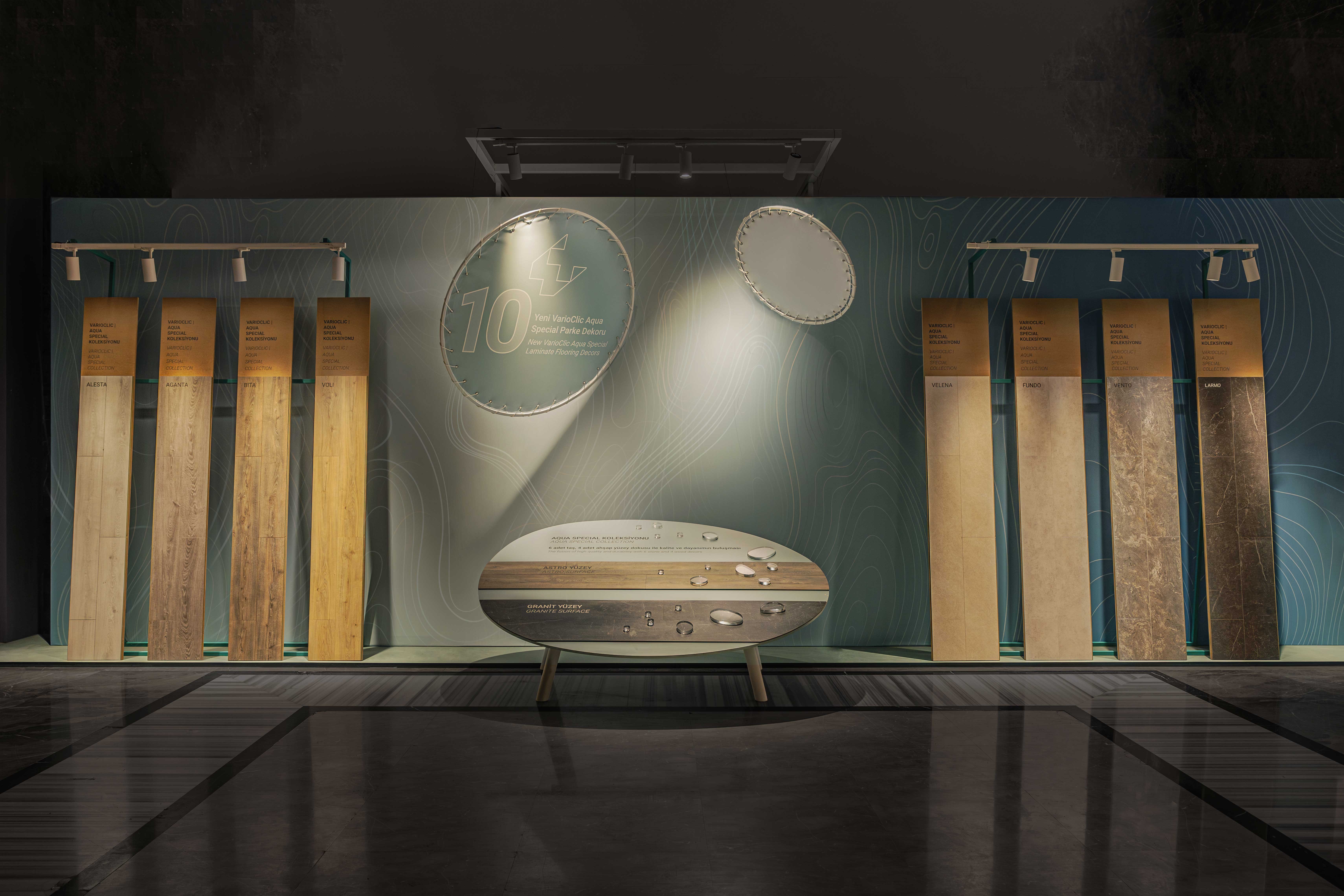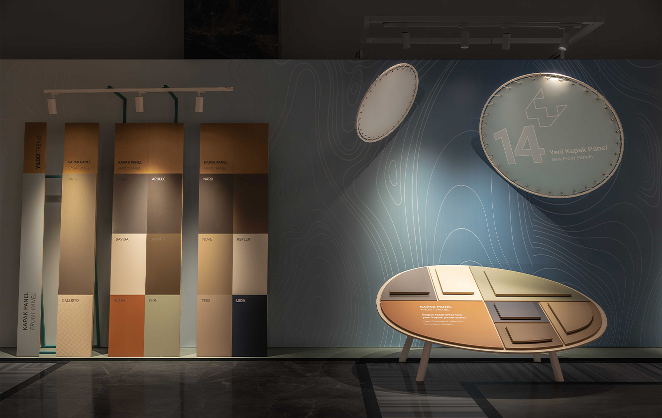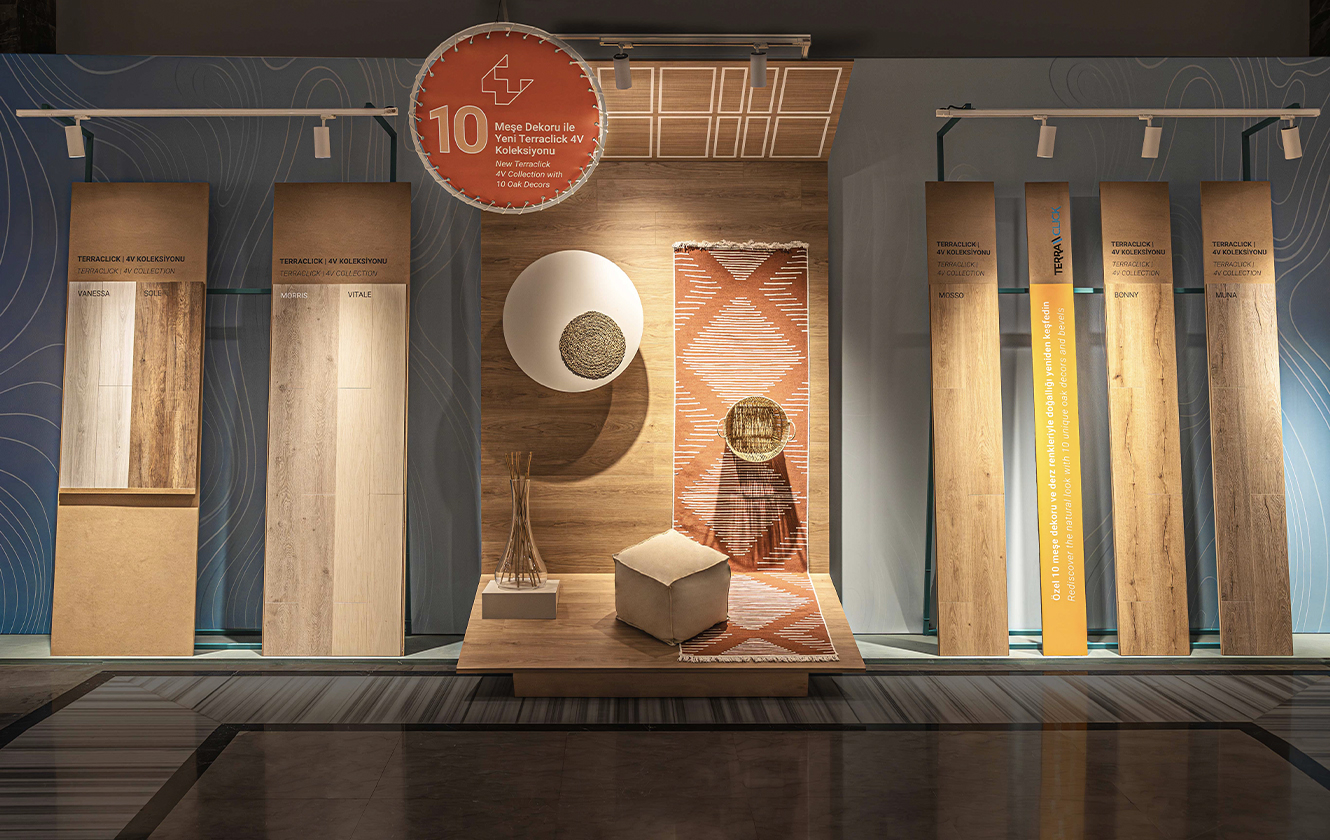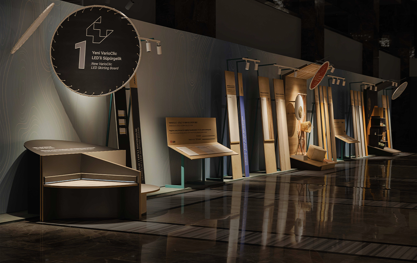 Pratik kurulum teknikleriyle çözümlenen modüler sergileme strüktürleri, ürün yüzeyini deneyimleten, ürünleri karşılaştırmayı kolaylaştıran bir sistemle tasarlandı. Yeni ürünlerin yaşam alanlarıyla çeşitlendirildiği kesitlerde, bir spor stüdyosunun içinden, şık bir rezidansın holünden, çağdaş bir evin samimi ruhunu yaşatan kompozisyonlarla zenginleştirildi.