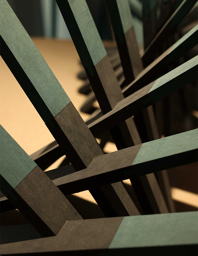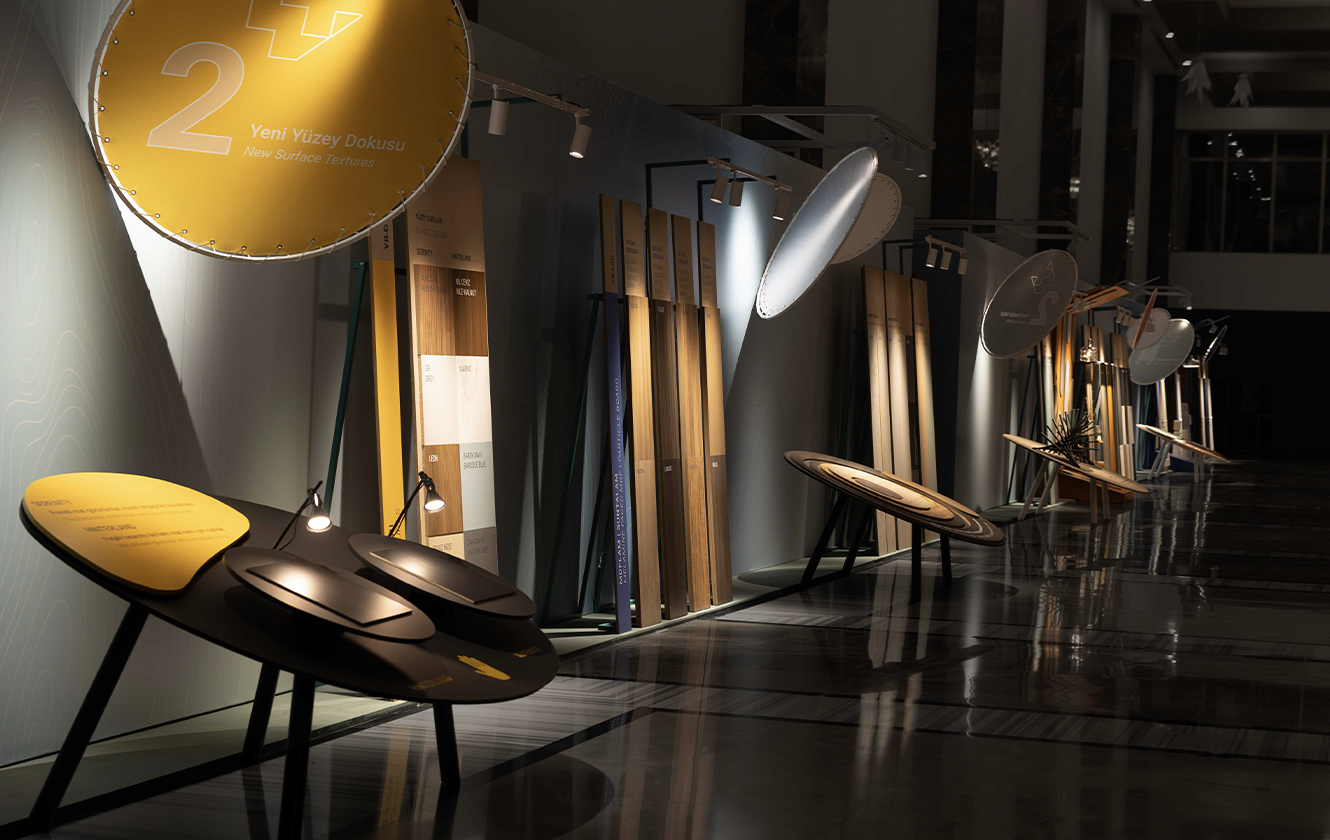Ürün niteliklerinin çarpıcı olarak iletişimin yapıldığı, çeşitli enstalasyonların konumlandırıldığı açılı dairesel masalar ve sergi boyunca yolculuğu kolaylaştıran masa üstü tipografik bilgi çemberleri, ürünlere ışık tutan birer spot gibi davranarak, ziyaretçilerin tüm yeniliklere koridor boyunca hakim olmasına katkı sundu.